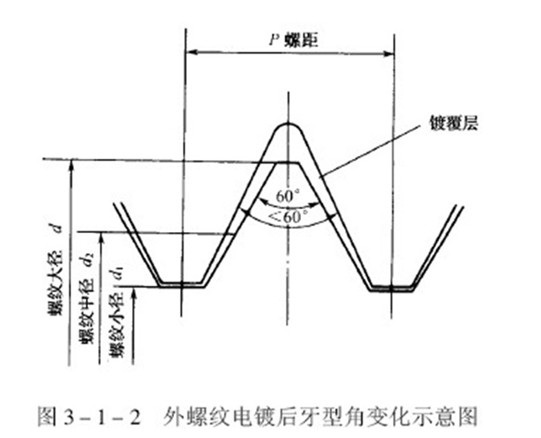 帶有普通螺紋的零件和緊固件,常遇到鍍覆后發(fā)生配合障礙的問題。當螺紋進行電鍍時,螺紋的牙尖部位和谷底部位的鍍層厚度是不一樣的,牙尖部位的鍍層厚度將明顯的大于谷底部位,隨著鍍層厚度的增加,它們之間的差異會越來越大,因此,螺紋的牙型角度變小,如圖所示。隨著螺紋直徑和螺距的不同,雖然牙尖和谷底部位鍍層厚度差異的比值也不同,但是隨著鍍層厚度增加,牙型角角度變小的傾向是始終如此的。螺紋直徑和螺距大一些,精度低一些,螺紋鍍后配合障礙就少一些,反之則多。實踐證明,螺紋電鍍后出現(xiàn)配合障礙的主要原因是牙型角鍍后的變形,其次才是鍍層厚度因素。