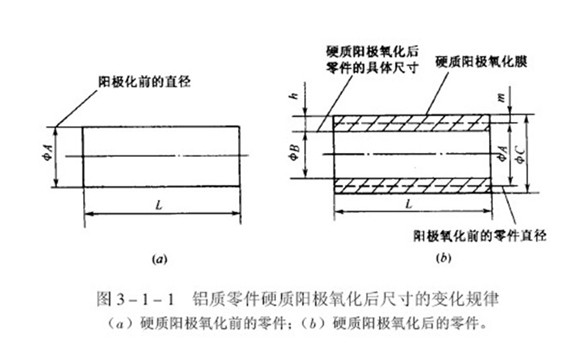 鋁及鋁合金表面上的硬質(zhì)陽極氧化膜,具有較高的硬度和優(yōu)良的耐磨性,是改善鋁質(zhì)零件表面耐磨性的常用手段,為了提高零件的使用壽命,產(chǎn)品設(shè)計通常要求硬質(zhì)陽極氧化膜層具有較大的厚度,因此,鋁質(zhì)零件硬質(zhì)陽極化以后,零件的最終尺寸變化就比較大,通常遵循這樣的規(guī)律,就是零件最終尺寸的增大值,大體上等于膜層厚度的1/2,如圖所示。該數(shù)值被廣泛用于估算鋁質(zhì)零件硬質(zhì)陽極化以后尺寸的變化規(guī)律。