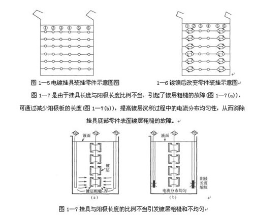 有些電鍍故障,經常出現在零件的固定部位或掛具某些部位的零件上。出現這種現象時,可以用改變零件的裝掛位置或裝掛方向,來觀察故障現象是否隨裝掛位置(或方向)的改變而改變,如圖1-5所示某塑料鍍鉻零件裝掛。在鍍鉻時經常在掛具左邊或右邊最外面一排零件出現棕褐色鉻層。出現故障后,一直認為這種故障是鍍鉻過程中產生的,所以就一直采取處理鍍鉻溶液的方法,但半年多都沒有排除故障,后來用改變零件裝掛位置進行試驗,發現故障起源于鍍鉻以前。故障現象出現在第1排或第6排零件上(偶爾也不出現這種故障),通過改變零件裝掛位置尋找故障的起源,將鍍好光亮鎳后的第1排與第2排的零件交換位置;第6排與第5排的零件交換位置(圖1-6)。改變裝掛位置以后進行鍍鉻,故障現象不是出現在最外面一排,而是出現在第2排或第5排的零件上。說明故障起源于鍍鉻以前,與鍍鉻液無關。經過多種方法試驗,最后找出來是光亮鎳鍍好以后出槽時,一個掛具零件還在電鍍,這一掛具出槽時,靠近電鍍掛具的出槽零件表面產生了雙性電極而造成的。可見這一起故障,若不用改變零件裝掛位置進行試驗,故障的起因就很難找到。